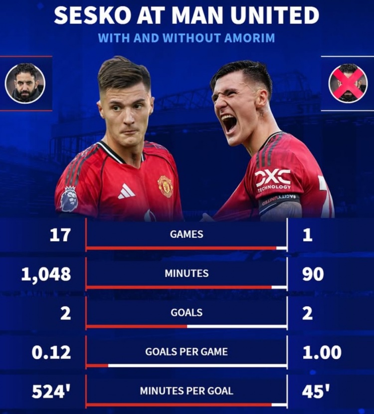 而阿莫林卸任后的首场比赛,他在90分钟内便打进2球,每45分钟就打进1球。