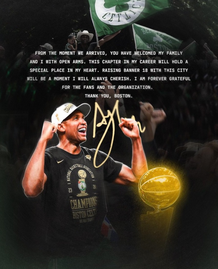 霍福德更新了个人社交媒体告别凯尔特人,他写道:“自我们抵达之日起,你们就以无比的热情欢迎了我和我的家人们。这段职业生涯的经历将永远在我心中占据一个特殊的位置。与这座城市一起升起第18面总冠军旗帜将是我此生永远铭记的一刻。我将永远感激球队和球迷们。谢谢你们,波士顿。”