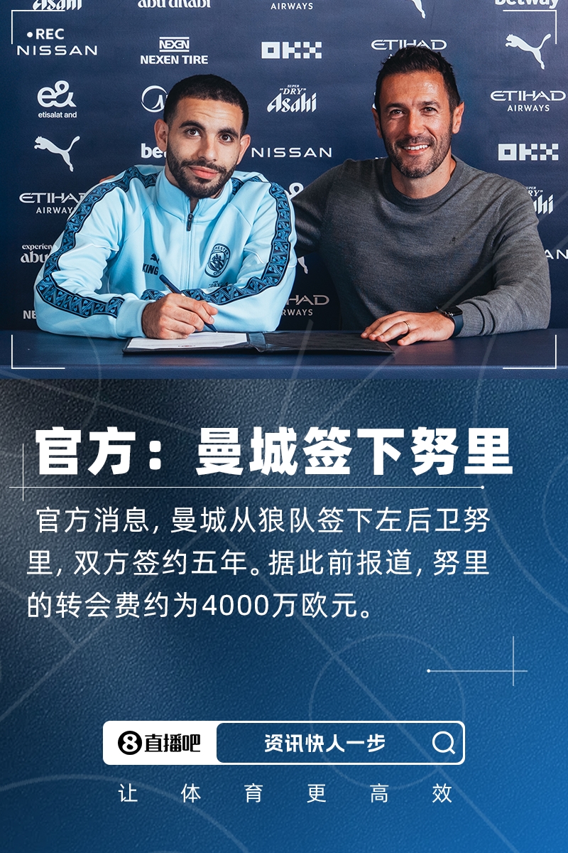 转会费4000万欧!官方:曼城签下24岁狼队左后卫努里