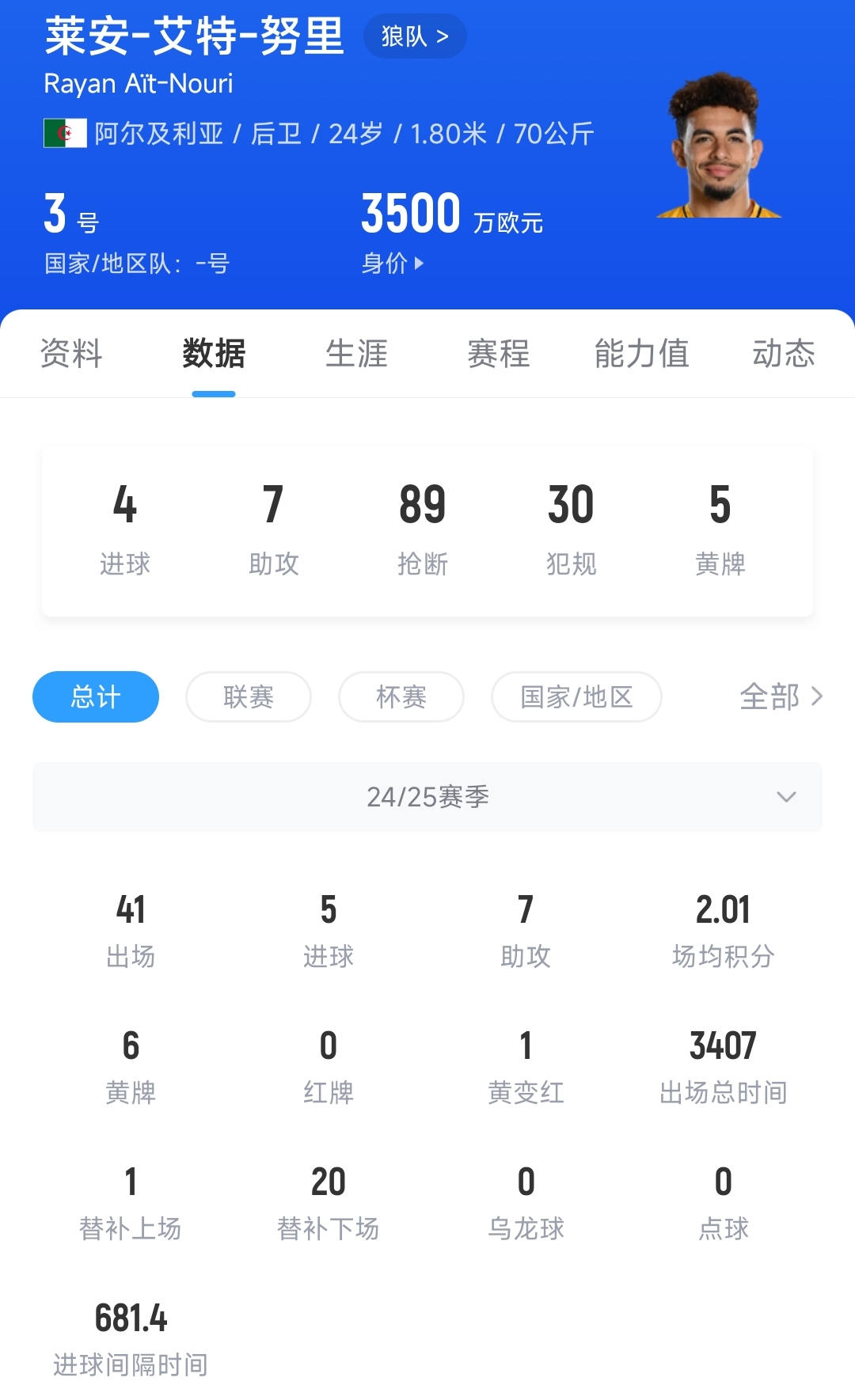 艾特-努里现年24岁,阿尔及利亚国籍,在场上主要司职左后卫,上赛季代表狼队出战41场比赛,贡献5粒进球和7次助攻。目前努里的德转身价为3500万欧元。